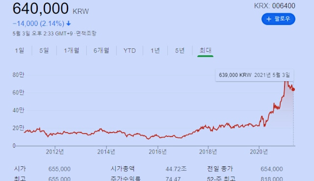 5월 3일 오후 기준으로 640,000원 전후의 주가를 보여주고 있습니다. 52주 최고가 기준의 주가는
