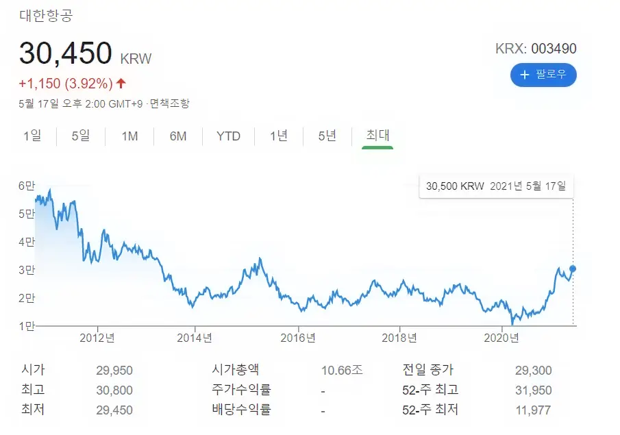 현재 대한항공 주가는 30,550원 정도 형성되어 있습니다.