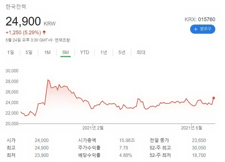 5월 24일 한국전력 주가는 전일대비 약 5% 상승하였습니다.