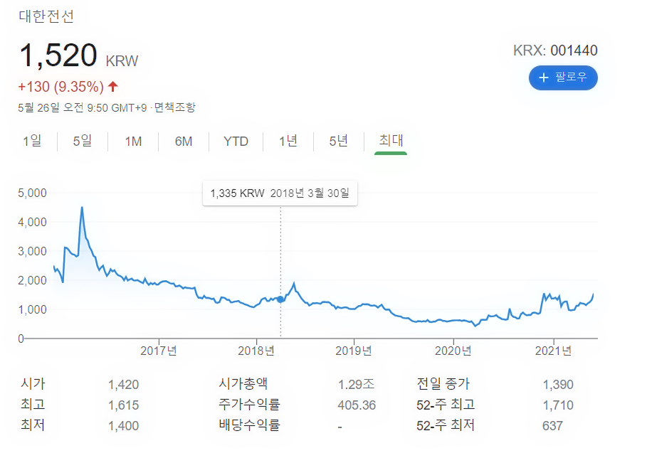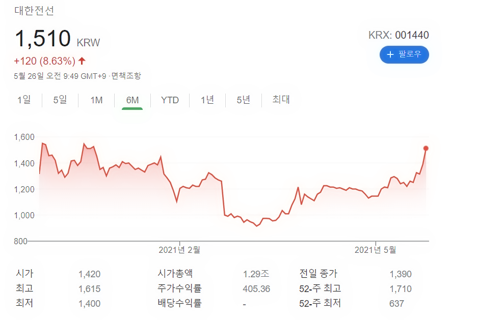 우선 현재로서는 대한전선 주가는 급등하고 있습니다. 지금 현재로 전일 대비하여 주가가 8%대를 넘어서기도