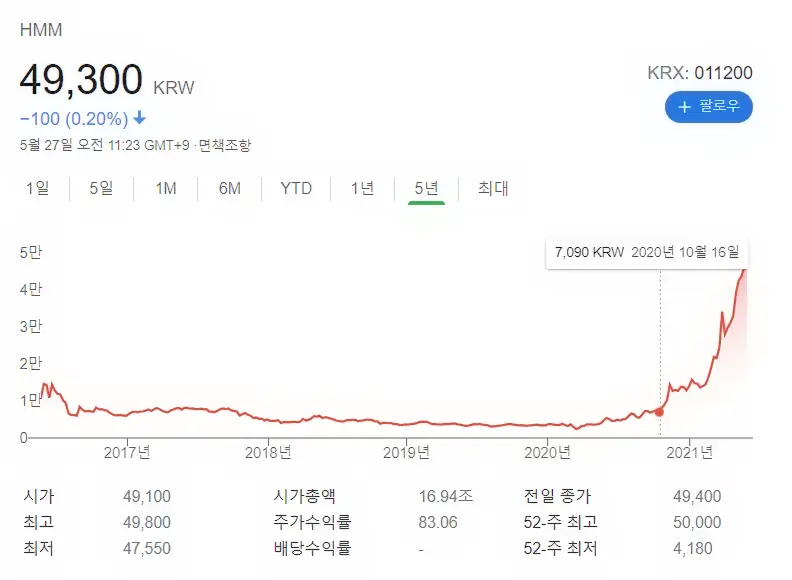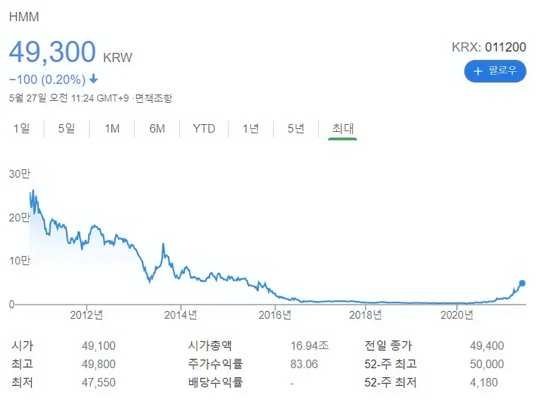 5월 27일 오전 기준으로 현재 HMM주가는 49,400원의 주가를 보여주고 있습니다.