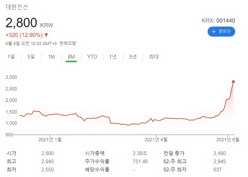 현재 대한전선 주가는 2,790원 선의 주가흐름을 보여주고 있습니다. 이는 전일대비해서 무려 12.5%나 상승한