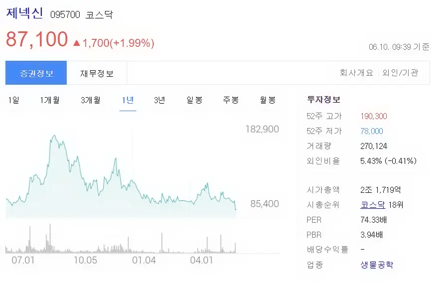 최근 주가 트렌드를 한번 살펴보겠습니다. 현재 6월 10일 오전 장 기준으로는 약 87,100원 정도의 주가를