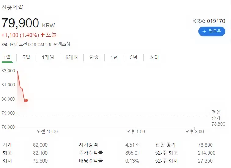 6월16일 오전 기준으로 현재 주가는 약 80,300원의 주가를 형성하고 있습니다.