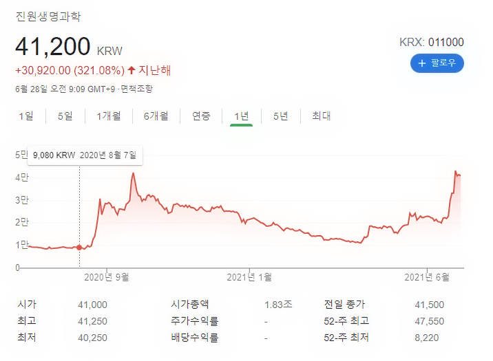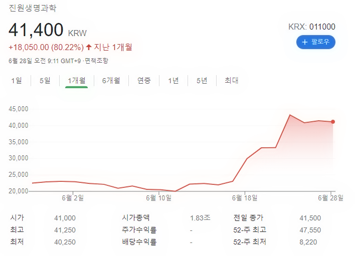 진원 생명과학 주가는 오늘 6월 28일 기준으로 지난 일주일간 무려 18%, 한 달 동안 무려 80%