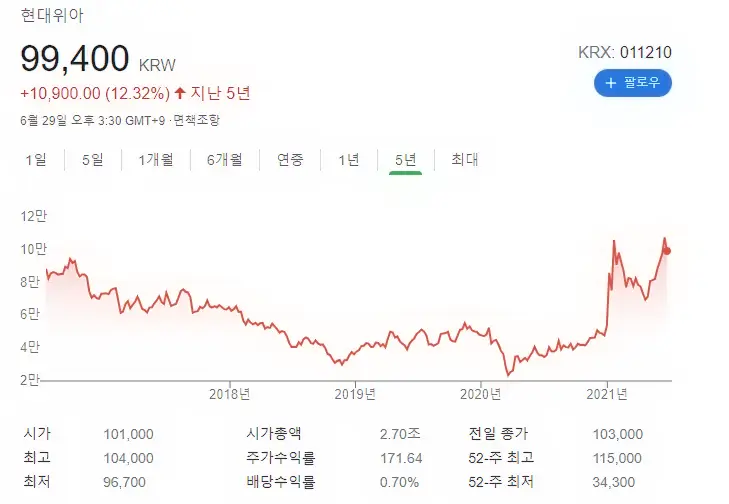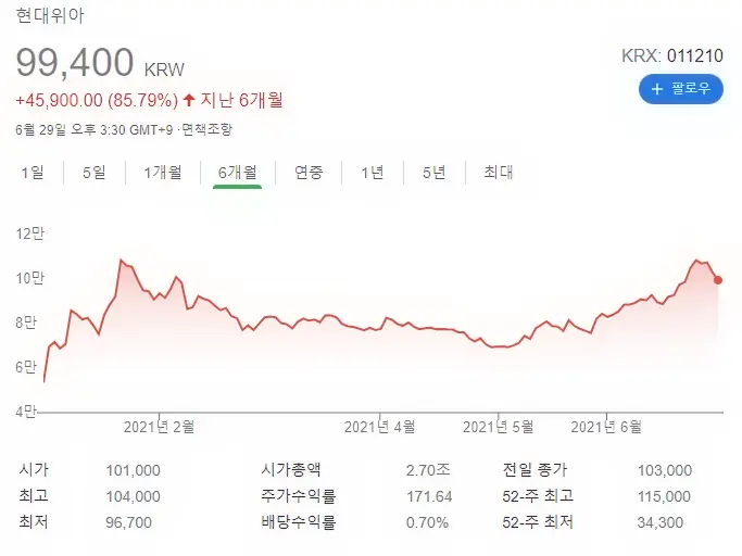 현재 6월29일자 99,400원의 주가를 형성하고 있습니다.