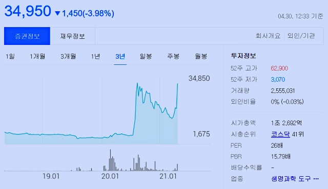 52주 최고가는 62,900원 주가를 기록하였으며 , 52주 최저가는 3,070원을 기록하였습니다.